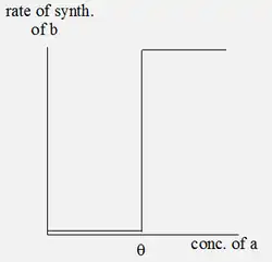 There is little effect of a, until it reaches a threshold concentration theta, and at higher concentrations a plateau is reached which shows the maximal rate of synthesis of b. Such a nonlinear, bounded curve is called a sigmoid. It can be suggested that a is "absent" for a < theta and "present" for a > theta. The sigmoid curve can be approximated by the step function, as in figure C.