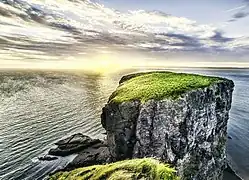 The glaciers began their retreat from in the Maritimes approximately 13,500 years ago,[3] with final deglaciation, post-glacial rebound, and sea level fluctuation ending and leaving the New England-Maritimes region virtually ice free 11,000 years ago.[4][5] The earliest evidence of Palaeo-Indian settlement in the region follows rapidly after deglaciation. Evidence of settlement found in the Debert Palaeo-Indian Site dates to 10,600 before present, though settlement seems likely to have occurred earlier,[4] following large game animals such as the caribou as they expanded into the land revealed by the retreating glaciers. The record of continuous habitation through the paleo and archaic period over ten thousand years culminated in the development of the culture, traditions, and language now known as the Mi'kmaq.[6]