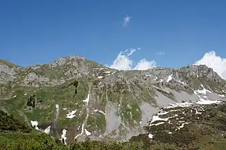 The Kinzig Pass is traversed by a trail connecting the Schächental in the Canton of Uri and the Muota Valley in the Canton of Schwyz. Starting from the south side of the range, the trail starts near Bürglen and Spiringen and crosses the pass to the village of Muotathal on the north side.[1] The top of the pass is southeast of the Rossstock, elevation 2,460 metres (8,071 ft), and south of the Chaiserstock, elevation 2,514 metres (8,248 ft).[2]