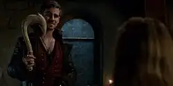 Hook arrived to confront Ahab, the current possessor of Maui's fish hook. However, Ahab starts taunting Hook, and rather than fighting, Hook and Ahab decided on a dice game with the winner getting the Jolly Roger and keeping the fish hook. Surprisingly enough, Hook wins the throw. But Ahab isn't convinced that Hook has returned to his swashbuckling ways, and as he follows Hook back to Rumple's cell the tensions between the two reach the point of taunting Hook for abandoning Alice. This leads to a gun duel between Hook and Ahab, and Hook again emerges as the winner, then runs off to return to Alice.