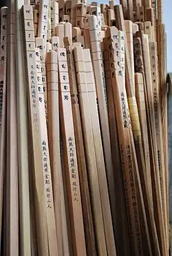 The kongō-zue or kongō-jō (金剛杖; 'vajra staff') is a wooden staff carried by yamabushi and pilgrims on the Shikoku Pilgrimage in Japan. The kongō-zue is said to represent the body of Kūkai and to support the pilgrim along the way; as such it is treated with respect, having its "feet" washed and being brought inside at the end of each day's journey.[1][2] It is inscribed with the chant Namu-Daishi-Henjō-Kongō and Dōgyō-Ninin or "We two pilgrims together".[3] By another tradition, it is carried aloft when crossing a bridge so that it does not touch the ground and wake Kōbō Daishi.[4] Pilgrims leave their kongō-zue at Ōkubo-ji, the final temple, upon completion of the circuit.[4] There is an occasional funerary practice in Shikoku and other parts of Japan whereby the decedent is dressed as a pilgrim and placed in the casket along with a staff and pilgrim's stamp book (nōkyōchō) for their final journey.[1]