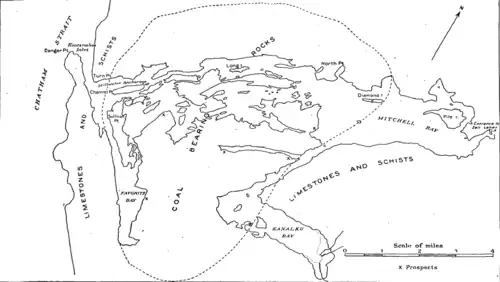 Coal bearing rocks of tertiary age (Eocene and younger) are noted at the inlet in a continuous sequence, The young flora found also point to the Oligocene age overlain by the Miocene age sedimentary rock. Volcanic rocks are noted in the area as seen from the sediment deposits at the inlet.[3] The geological formation of conglomerate, sandstone, siltstone, shale and coal in and around the inlet extending to a thickness varying from 2000 to 5000 ft are named as Kootznahoo Formation.[4]