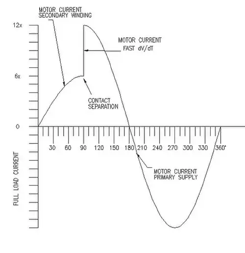 The root cause of destructive transients in Korndörfer starters, it is random switching of the changeover of motor current. The uncontrolled timing of the changeover allows the peak motor current to be switched at any point on the wave. Figure 5 shows the changeover at 90 degrees. This is a worst-case scenario, peak current at changeover, creates a very high and fast transient. The central switch circuit prevents voltage escalation, as discussed above. It is therefore desirable to control the point on the wave at which to switch, the ideal point is when the motor amperes to the lowest value in all the active windings of the autotransformer.