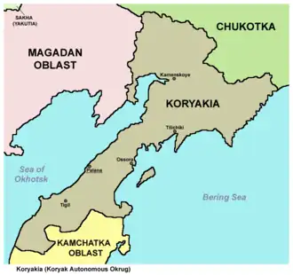 Koryak Okrug (Russian: Коря́кский о́круг, romanized: Koryakskiy okrug; Koryak: Чав’чываокруг, Cav’cәvaokrug), or Koryakia (Russian: Корякия, romanized: Koryakiya), was an administrative division with a special status within Kamchatka Krai, Russia.[1] It was a federal subject of Russia (an autonomous okrug of Kamchatka Oblast) from 1931[2] until July 1, 2007, when it merged with Kamchatka Oblast. Prior to the merger, it was called Koryak Autonomous Okrug (Коря́кский автоно́мный о́круг). Its administrative center was the urban locality (an urban-type settlement) of Palana. Population: 18,759 (2010 Census);[3] 25,157 (2002 Census);[4] 39,363 (1989 Soviet census).[5]