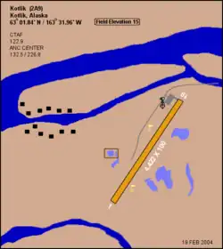Kotlik Airport (IATA: KOT[3], ICAO: PFKO[4], FAA LID: 2A9) is a state-owned public-use airport located one nautical mile (1.85 km) west of the central business district of Kotlik, a city in the Kusilvak Census Area of the U.S. state of Alaska.[1]
