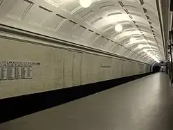 Architects Ivan Fomin and N. Andrikanis designed the station.[1] It was one of Moscow's first four deep-level stations, and one of the first two to employ a three-arched design with three parallel, circular tunnels. In this type of station, the outer tubes (which house the tracks and platforms) are separated from the larger central hall by heavy pylons. This design was planned to be used for the first time on the four central-city stations on the first Metro line, Krasnye Vorota, Chistye Prudy, Lubyanka, and Okhotnyi Ryad. However, due to construction difficulties a simpler two-arched design was implemented at Lubyanka and Chistye Prudy.