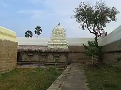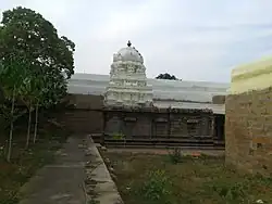 The temple occupies an area of 1.8 acres (0.73 ha) and is surrounded by a granite walls. The temple had originally three precincts, the outer one of which was demolished by Chanda Sahib at the orders of Nawab of Arcot. The stones were used to build the fort at Palayamkottai. The five tiered rajagopuram, the temple's gateway tower, is 110 ft (34 m) tall. The sanctum houses the image of Venkatachalapathy in standing posture 4 ft (1.2 m) is made of granite sporting four arms. Two of his arms hold the conch and Chakra, while the other two sport Abayamudra and Kadahasta. The images of Sridevi and Bhudevi are located on either of his side. The festive image is called Srinivasan and the image has identical features as that of the presiding deity. The Ardha mandapa is guarded by two Dwarapalas on either sides.[1][2] There is a separate shrine of Alamelumangai in the third precinct, which also houses the festival image.