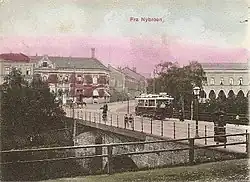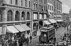 The Rodeløkka Line was completed by January 1900. However, there was not sufficient electricity available to power the tramway. Operations did not commence until March, when the power use for lighting was reduced. It also initially received a ten-minute headway, limited by the amount of available power.[7] The route ran from Rodeløkka to Nybrua, when it connected to KSS's Grünerløkka–Torshov Line and ran to the latter's main downtown terminal of Egertorget. From June an agreement was reached with KES, allow the Sagene services to run along their Skøyen Line from Athenæum to Jernbanetorget, serving Oslo East Station.[8]