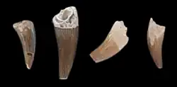 Teeth of cartilaginous fish, such as sharks, rays and chimaerids are relatively common fossil finds.[5] In particular, the basin was home to a highly diverse shark fauna; the lamniform sharks present are the most diverse Late Cretaceous lamniform fauna yet discovered.[7] Most of the sharks in the basin were lamniforms and were either nectonic (swimming freely in the body of water) or nectobenthic (active just above the sea floor).[1] In addition to the lamniforms, other groups were present, including other galeomorphs, hybodonts and squalomorphs. Among the hybodonts were the genera Polyacrodus and Meristodon, which went extinct in the early Campanian, before the time when a majority of the local fossil fauna lived. Squalomorphs were represented by smaller squaliforms, hexanchiforms and angelsharks. Among the non-lamniform galeomorphs were bullhead sharks (such as Heterodontus), ground sharks, carpet sharks and synechodontiforms.[5] All shark species found in the Kristianstad Basin were active predators, but many of them only fed on smaller food items such as bony fish and various invertebrates.[10] Large nektonic lamniform sharks, such as Squalicorax and Cretoxyrhina, presumably occupied the top of the food web.[10] The largest sharks presumably fed on most of the animals present in the basin, including sea turtles, smaller mosasaurs, plesiosaurs and other sharks.[5] Bite marks from sharks are relatively common on reptile bones in the Kristianstad Basin.[10] The overall most common genus of shark found is the lamniform Carcharias.[1]