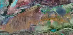 A map published by the National Geographic Society[2] shows a much smaller Kumtag. This is a rectangle with a northwest corner south of Lop Nor, a southern edge along the Altyn-Tagh and an eastern edge just beyond the Gansu border. Near the northeast corner is the Jade Gate which is often taken as the western end of the Great Wall. From space it appears as a belt of orange sand dunes. This is probably the 2500 square kilometer area mentioned below.