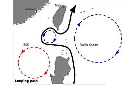 A northward flowing WBC (like the Kuroshio Current) can deform at a gap in a western boundary and form an anticyclonic current loop if the gap is wide enough.[5] This results in a looping path, where water from the Kuroshio flows through the middle of the Luzon Strait into the SCS and out in the north of the strait. The current loop in the SCS forms due to Ekman transport resulting from northeasterly winds that push Kuroshio surface water westward.[6] Anticyclonic eddies can shed from the current loop and penetrate farther into the SCS, as has been observed by Li (1997) [7]