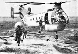 Coastal rangers jumps off a Piasecki H-21 helicopter in late 1950s.