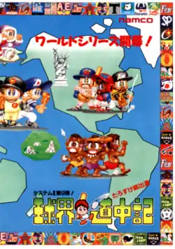 Kyūkai Dōchūki[a] is a baseball arcade game that was released by Namco in 1990 in Japan; it runs on Namco System 2 hardware, and is a spin-off of Yokai Dochuki. The gameplay is similar to Namco's own World Stadium series, except that both players have a total of thirty-six different teams to choose from in the Japanese, Arabic, German, Humbaba, American, Russian, and Chinese leagues. The Japan League has five stadiums, and if the player selects one team from it, the game will randomly decide which stadium the match will take place in, but the other leagues only have one stadium. This game also features a cameo re-appearance, from Valkyrie (as in no Densetsu), who appears to report the final outcome of a match once it has finished. Namco's signature character Pac-Man can also be seen on two of the television screens in a studio wearing a purple bow tie (in his Pac-Land-style anthropomorphized form, as opposed to his "original" one).