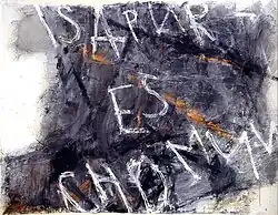 Lakner's guest stay 1981-1982 in New York at MoMA PS1 studio and gallery[65] was significant. Here Lakner experienced the illness and death of a good friend. During this time, he became also aware of graffiti on the walls of houses and in subway shafts. As a result, he painted on large bed sheets, in which individual words or slogans were applied with spray paint. "At that time, the graffiti of the Puerto Rican boys in the streets of New York meant more to me than anything else I saw in museums and galleries." He wanted "Black Milk", the words from Paul Celan's poem Death Fugue, "written big on a wall with a flamethrower."[66] In Isa Pur, Museum Ludwig, Cologne, he cites the oldest Hungarian Funeral Sermon and Prayer written in Latin script: “Behold, we are dust and ashes”. The single letters above the patchy colored ground are created by spray paint, or the paint is scratched away, reinforcing his narrative about life and death.[67][68]