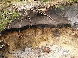 By cutting the turf the regenerative capacity of the soils was exhausted. The regular removal of the top layer of soil contributed to the spreading of heathland. As heather decomposes, the pH value of the soil falls drastically, as far as the iron buffer-region at pH 3, which initiates the process of podsolisation. Soil life is severely damaged, which results in a hard layer of earth underneath the root zone on the heath at a depth of about 40 centimetres (16 in). The iron and humus particles released by the topsoil precipitate onto this impervious hardpan. The subsoil thus separates itself from the topsoil. The nutrients are largely washed out of the topsoil which leads to leaching and causes the typical grey-white coloration of the paths on the heath.