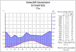 Lüneburg Heath lies in a temperate maritime climatic region moderated by the Atlantic, with mild winters, cool summers and precipitation all-year round. The Hohe Heide, however, has a "low mountain climate" with lower temperatures and higher precipitation than in the surrounding area.