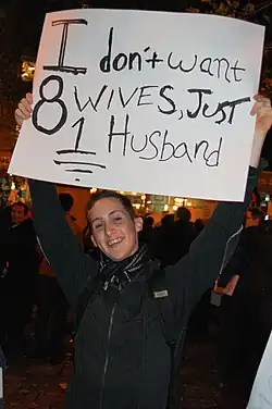 A Prop 8 protester with a sign referencing the LDS Church's polygamous history.