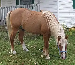 Ojibwe Horses were believed to be a landrace cross of Canadian horse and Spanish Colonial horse or Mustang breeding. However, this proved to be incorrect by later genetic studies.[4] These original horses declined to the point that by 1977 only four mares remained,[5] at which time their bloodlines were crossed with Spanish Mustang stallions.[1] Blood-typing studies conducted by Gus Cothran at the University of Kentucky indicate that the ponies have British pony ancestry as well as some Iberian horse markers.[2] They are classified as an indigenous horse breed of Canada, but are at risk of a genetic bottleneck. A 2011 study found they had the second-lowest average effective number of alleles and allelic richness (2.83 and 4.01) among several breeds of pony breeds found in Canada.[6] A 2012 study of matrilineal genetics verified Nordic horse and British pony breed ancestry, with Iberian origins indicated but more difficult to verify on account of modern Spanish Mustang crossbreeding.[7]