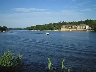 Lake Hamilton is a 7,200-acre (2,900 ha) reservoir near Lake Hamilton, Arkansas and Hot Springs, Arkansas, located on the Ouachita River. It was named after Hamilton Moses, who later became president and chairman of the board for Arkansas Power and Light.[5][6] The lake was created in 1932, formed as a result of Carpenter Dam (after Flavius Josephus Carpenter) which was constructed to generate hydroelectric power. The dam, which extends in a length of 1,000 feet (300 m) and a height of 100 feet (30 m) high, was completed a year earlier in 1931.[7] The lake subsequently functioned as a recreational site after attracting tourists, later spurring the development of resorts, restaurants, motels, and water sport facilities in its area. The Garvan Woodland Gardens, a 210-acre (85 ha) botanical park is located along its shore. Carpenter Dam was later listed on the National Register of Historic Places in 1992.[7]