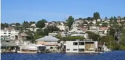 Floating homes line the east and west sides of Lake Union. In Sleepless in Seattle, the character played by Tom Hanks lived on one of these homes.[9]
