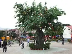 On 12 February 2005, the fourth day of the Chinese New Year,[8] one of the branches was broken due to the large amount of oranges and paper offerings that were thrown onto the banyan tree.[9] The accident injured a man aged 62 and a four-year-old boy.[9] Tree experts soon examined the structure and condition of the wishing tree, and concluded that all unhealthy branches would be removed, and wounds on the tree had been treated to avoid infection.[8] As a result, the throwing of "Bao Die" was quickly prohibited by the government after the incident,[8] meanwhile reinforcing the wishing tradition by letting people hang the offerings on a wooden frame placed next to the original banyan tree.[8][10] Due to the lack of attractiveness of the attraction, a new plastic tree from Guangzhou was purchased in late 2009; plastic mandarin oranges are now only allowed to be tied to the branches.[11][12][13] The tradition was able to continue since then.