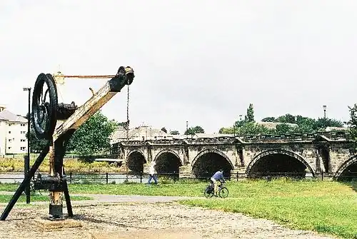 The Greyhound Bridge was converted for use by the A589 road from 1972.[10][11] The site of Green Ayre station is now a public park. Nothing remains of the station,[12] but a goods crane from Hornby goods shed has been erected in the park near the site.[10][13] The site of the adjacent locomotive shed is now occupied by a supermarket.