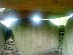 Common Neolithic funerary goods found in the dolmens of the region are tools, pottery, and amber pearls.[14] It is assumed that the pots were filled with groceries, and that there were also other, long decomposed organic funerary goods.[14] Most probably, a magic function was ascribed to the amber pearls, especially the ones of a double axe shape.[14] Funerary goods found in each dolmen near Lancken include flint hatches, chisels, amber pearls, and pottery,[15] the latter being in part of the Funnelbeaker (TRB) type.[16] An abundance of arrowheads were found in dolmens Nr. 1 through 5.[17] Stone blades were found in dolmens Nr. 1, 3, 4 and 5.[17] Two stone axes were excavated in dolmen Nr. 1, one double-edged,[9] and another two stone axes were found in dolmen Nr. 3, one of the rare Nackenkammaxt type.[11] Other finds include a granite rubbing stone (dolmen Nr. 3)[11] and a Gnidel- or Krähenstein (dolmen Nr. 4,[7] a small, black flintstone rounded by the sea). Remains of human skulls and bones were found in dolmen Nr. 3[11] and Nr. 4.[7]