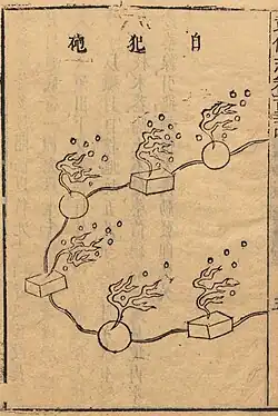 Another victim-operated device was the "underground sky-soaring thunder", which lured bounty hunters with halberds, pikes, and lances planted in the ground. If they pulled on one of these weapons, the butt end disturbed a bowl underneath and a slow-burning incandescent material in the bowl ignited the fuses.[18][19]
