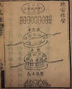 The Huolongjing also describes land mines that were set off by enemy movement. A 9-foot (3 m) length of bamboo was waterproofed by wrapping it in cowhide and covering it with oil. It was filled with compressed gunpowder and lead or iron pellets, sealed with wax and concealed in a trench.[15] The triggering mechanism was not fully described until the early 17th century. When the enemy stepped onto hidden boards, they dislodged a pin, causing a weight to fall. A cord attached to the weight was wrapped around a drum attached to two steel wheels; when the weight fell, the wheels struck sparks against flint, igniting a set of fuses leading to multiple mines. A similar mechanism was used in the first wheellock musket in Europe as sketched by Leonardo da Vinci around 1500 AD.[17]