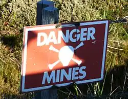 One of the most heavily mined areas was Surf Beach, located just to the north of the capital Stanley, where 1,000 mines were laid just to the rear of the beach.[9] Much of Stanley Common, a public access area, was also mined and remained out of use for many years.[10] One abandoned building, located near the Murrell Peninsula minefield, was suspected of being booby-trapped and fenced off.[11] During the demining operation at least six improvised booby traps were recovered, consisting of tripwires connected to TNT charges.[12]: C-1