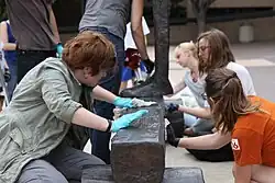 LPG volunteers clean Figure on a Trunk by Magdalena Abakanowicz