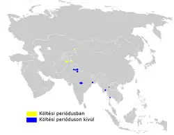 The specimens from Afghanistan and Kazakhstan suggest that they breed in Central Asia and moult indicates that they migrate along the Himalayas to winter in northern India and Southeast Asia. Sequence variation points to a stable or shrinking population structure.[6]