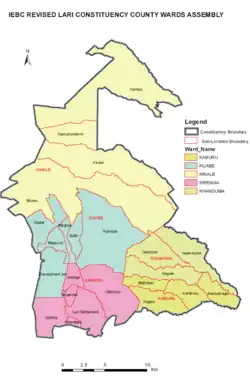 Lari Constituency is an electoral constituency in Kenya, located in the northwestern part of Kiambu County. The constituency was established in 1966 from Limuru Constituency. Lari borders Kinangop to the North, Limuru to the South, Githunguri and Gatundu North constituencies to the east and Naivasha Constituency to the west. Lari is one of the 12 constituencies in Kiambu County, and is further divided to five wards each electing a representative to the Kiambu County Assembly.