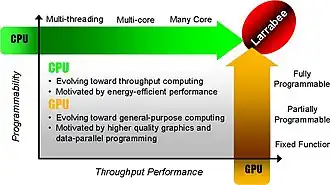 As a GPU, Larrabee would have supported traditional rasterized 3D graphics (Direct3D & OpenGL) for games. However, its hybridization of CPU and GPU features should also have been suitable for general purpose GPU (GPGPU) or stream processing tasks. For example, it might have performed ray tracing or physics processing,[13] in real time for games or offline for scientific research as a component of a supercomputer.[14]
