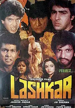 Lashkar (Army) is a 1989 Bollywood action film directed by Jagdish Kadar, starring Dev Anand, Aditya Pancholi, Sonam, Madhavi, Hemant Birje, Sumeet Saigal, Jaaved Jaffrey, Kiran Kumar and Sadashiv Amrapurkar.[1] The movie was a huge commission earner at the box office and is believed to be one of the last commercial successes of Dev Anand. This was the only film in the late 1980s that Dev Anand starred in that he did not produce or direct, but acted in the lead role and the film was a major box office success.[2]