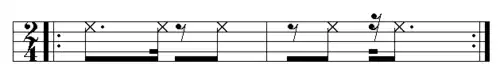 Although the exact origins of jazz syncopation may never be known, there is evidence that the habanera-tresillo was there at its conception. Buddy Bolden, the first known jazz musician, is credited with creating the big four, a habanera-based pattern. The big four (below) was the first syncopated bass drum pattern to deviate from the standard on-the-beat march.[9] As the example below shows, the second half of the big four pattern is the habanera rhythm.