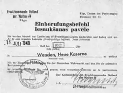Under the Rosenberg labor decree of December 1941, the Germans had already begun conscripting Latvians in early 1942, giving them a choice between joining the labor service or the police battalions.[11] One month after the unit was founded, German occupation authorities in Latvia started conscripting military-age men specifically for the Legion. Draftees were given a choice between serving in the Wehrmacht-subordinated Waffen-SS Legion, serving as German Wehrmacht auxiliaries, or being sent to a slave labor camp in Germany. Those who tried to avoid both options were arrested and sent to concentration camps.[12] As a result, only 15-20% of the men serving in the legion were actual volunteers.[6] Unlike in Lithuania, potential legionary recruits in Latvia did not organize an official boycott of conscription; some Latvians deserted however rather than serve in the Nazi war effort.[1]