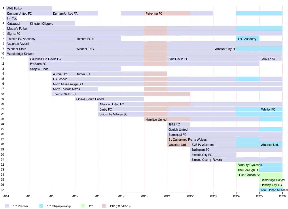 As of 2025 there are 26 clubs of whom 4 are based in Toronto, 12 are based elsewhere in the Greater Toronto Area, 9 are based in other cities in Southern Ontario and there is 1 club based in Northern Ontario.[note 1]