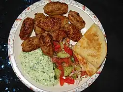 Raita, salad with sumac, kafta, and a prepared plate of kafta with sides