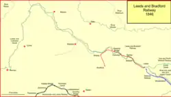During the parliamentary hearings for the Leeds and Bradford Railway Bill, the company had given an undertaking to extend the line as far as Keighley. In fact the company considered the matter and decided to extend still further, to Skipton and Colne. An end-on junction at Colne with the East Lancashire Railway would give through access to Liverpool and Manchester.[14] This was authorised by the Leeds and Bradford Railway Act 1845 (8 & 9 Vict. c. xxxviii), of 30 June 1845. This was an authorising act of Parliament, but there was never separate company for the extension: the L&BR was leased to the Midland Railway.[15][16]