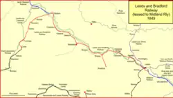 Another independent company was being projected at this time, the North Western Railway, which was planned to form a junction with the Leeds and Bradford extension line at Skipton, and continue west to Morecambe Bay, making a junction en route with the Lancaster and Carlisle Railway. The Midland Railway's alliance with the Leeds and Bradford Railway was proving fruitful, by giving access to these proposed connecting lines.[1]