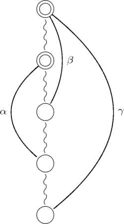 In the following figures, simple circle nodes represent vertices, double circle nodes represent subtrees, twisted segments represent tree paths, and curved arcs represent cotree edges. The root of each tree is shown at the bottom of the figure. In the first figure, the edges labeled and are T-alike, meaning that, at the endpoints nearest the root of the tree, they will both be on the same side of the tree in every planar drawing. In the next two figures, the edges with the same labels are T-opposite, meaning that they will be on different sides of the tree in every planar drawing.