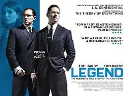 Legend is a 2015 biographical action film written and directed by Brian Helgeland, adapted from John Pearson's book The Profession of Violence: The Rise and Fall of the Kray Twins.[6][7] The film follows the Kray twins' career and relationship together through their convictions for murder and sentencing to life imprisonment in 1969.[8][9] Tom Hardy plays both Reggie and Ron Kray in a dual role.