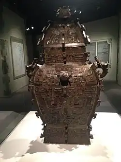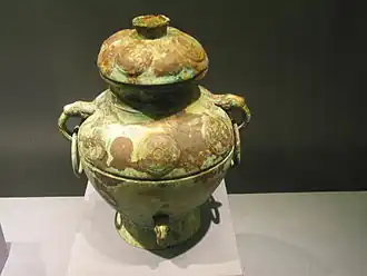 A lei (Chinese: 罍; pinyin: léi) is a large bronze wine jar used from the late Shang dynasty period to the Eastern Zhou dynasty period in ancient China, with a characteristic double-eared and narrow-necked shape. They come in square and round varieties, with the former used by the Shang, and the latter used by both the Shang and Zhou. Over time, the form of the lei gradually transitioned from thin, tall vessels to shorter jars. Within the Erligang culture, lei vessels were cast in the Central Plains and exported to the middle reaches of the Yangtze River.[1]