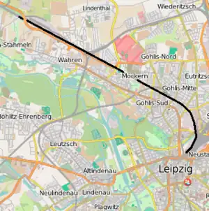 The route runs in a straight line to the southeast as far as Leipzig-Gohlis and passes through the Leipzig suburbs of Lützschena, Stahmeln, Wahren, Möckern and Gohlis. On the route, it passes under federal highway 6 near Lützschena and over the Leipzig freight ring between Wahren and Möckern. In the vicinity of Breitenfelder Straße in the district of Gohlis, it crosses the Leipzig–Großkorbetha railway, which approached from the south-west, before the latter meets the line at the halt of Gohlis and from then on runs parallel with it. After a right turn, the line connects with the Großkorbetha railway to and from Wahren and Leutzsch at the "MTh" (Magdeburg-Thuringian) flying junction, which allows connections towards the City Tunnel and the train shed of the Leipzig Hbf, and runs down the western tunnel ramp into the Leipzig City Tunnel. In the subterranean flying junction, the line passes on to underground track 9396 at the northern entrance to the underground platform.