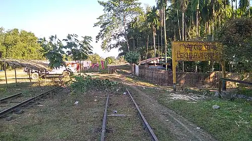 Lekhapani railway station, opened around 1890, was a major coal-loading point for Tipong collieries. There is a display tablet at the station which says that the station was closed to commercial traffic in 1993 and the last train ran on the line in 1997. The railway station was restored in 2009.[1][2]