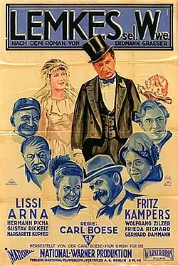 Lemke's Widow (German: Lemkes sel. Witwe) is a 1928 German silent comedy film directed by Carl Boese.[1] It was shot at the National Studios in Berlin. The film's sets were designed by Karl Machus. The film was remade in 1957 with Grethe Weiser in the title role.