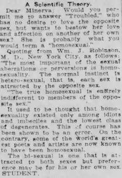 The earliest published studies of lesbian activity were written in the early 20th century, and many were based on observations of, and data gathered from, incarcerated women. Margaret Otis published "A Perversion Not Commonly Noted" in the 1913 Journal of Psychology, coupling a decidedly Puritanical moral foundation with an almost revolutionary sympathy for lesbian relationships; her focus revolved more around her revulsion for sexual contact between those of different ethnic backgrounds, yet offered an almost radical tolerance of the lesbian relations themselves, as Otis noted, "Sometimes the love (of one young woman for another) is very real and seems almost ennobling".[22] This document provided a rare view from a tightly controlled setting monitored by a corrections supervisor. Kate Richards O'Hare, imprisoned in 1917 for five years under the Espionage Act of 1917, published a firsthand account of incarcerated women In Prison[23] complete with frightening accounts of lesbian sexual abuse among inmates. So wrote O'Hare: "...A thorough education in sex perversions is part of the educational system of most prisons, and for the most part the underkeepers [sic] and the stool pigeons are very efficient teachers..." O'Hare then recounted a systematic induction of women into a cycle of forced prostitution to which authorities turned a blind eye: "...there seems to be considerable ground for the commonly accepted belief of the prison inmates that much of its graft and profits may percolate upward to the under officials...the...stool pigeon...handled the vices so rampant in the prison...she, in fact, held the power of life and death over us, by being able to secure endless punishments in the blind, she could and did compel indulgence in this vice in order that its profits might be secured".[22]