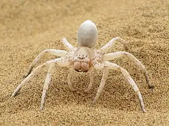Leucorchestris arenicola, commonly called the dancing white lady spider, is a huntsman spider in the family Sparassidae and genus Leucorchestris. It is commonly found in the Namib desert of Namibia. It is often mistaken with the similarly named Carparachne aureoflava, more commonly known as the wheel spider, from the same location.[1][2] L. arenicola relies on seismic vibrations, called drumming, for communication. It taps its foremost legs on the sand to send messages to other white lady spiders. Male L. arenicola will travel over 50 metres in one night searching for a mate. If they find a mate, they must be extremely careful, for drumming the wrong message can be deadly.[1] One of the major features that characterizes its nocturnal behavior is its specialized vision, using eight eyes in different orientations to capture a panoramic view of the surroundings. L. arenicola spiders use temporal summation in order to be able to see dim lighting during night-time wanderings.[3] The species was first described by Reginald Frederick Lawrence in 1962, who described all the species in the genus Leucorchestris.[2]
