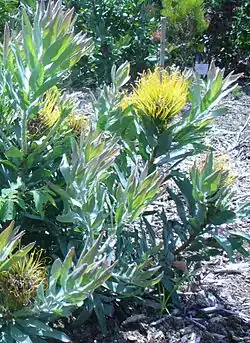 Leucospermum formosum is a large upright shrub of up to 3 m (9.8 ft) high, from the family Proteaceae. It grows from a single trunk and its branches are greyish felty. The softly felty leaves are lance-shaped to elliptic, 6+12–10 cm (2.6–3.9 in) long and 14–20 mm (0.55–0.79 in) wide. The flower heads are flattened and about 15 cm (5.9 in) across, and consist of bright yellow flowers from which long, styles emerge which are strongly clockwise bent just below the white, later pink thickened tip. From above, the heads look like turning wheels. It is called silver-leaf wheel-pincushion in English. It flowers during September and October. It is an endemic species of the Western Cape province of South Africa.[3][4]